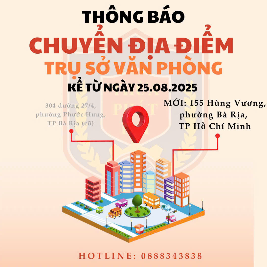 Kể từ ngày 25.08.2025, Văn phòng Thừa Phát Lại Bà Rịa – Vũng Tàu chuyển về địa chỉ mới: 155 Hùng Vương, phường Bà Rịa, TP. Hồ Chí Minh
